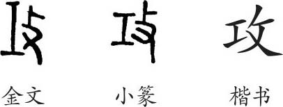 “攻”是形声字。金文从攴,工声。小篆的写法与金文基本一样。隶变后楷书写作“攻”,改为从攵(反文旁)。