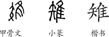 “雉”是会意兼形声字。甲骨文从隹(鸟),从矢,会用箭射取野鸡之意,矢兼表声。小篆整齐化。隶变后楷书写作“雉”。