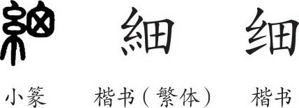 “细”是形声字。小篆从糸,囟声。隶变后楷书写作“細”。汉字简化写作“细”。