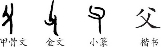 “父”是会意字。甲骨文左边的一条竖线像石斧一类的工具之形,右下是一只手,会手持工具之意。金文大体相同。隶变后楷书写作“父”。