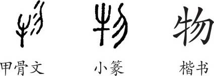 《说文·牛部》:“物,万物也。牛为大物;天地之数,起于牵牛。故从牛,勿声。”(物,万物。牛是万物中的大物;天地间的事数,兴起于牵牛而耕。所以物从牛,勿声。)
