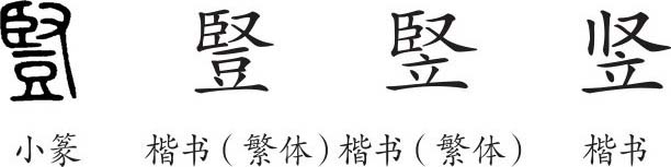 “竖”是会意兼形声字。小篆从臤(操作)从豆(高脚食器)会意,表示如豆样坚立,豆兼表声。隶变后楷书写作“豎”;俗作“竪”,改为从立。汉字简化后写作“竖”。