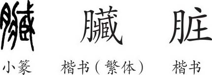 “脏”是会意兼形声字。楷书繁体写作“臟”,从肉(月)从藏会意,藏兼表声。汉字简化后写作“脏”。