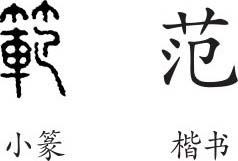 “范”是形声字。小篆从艸(艹),汜声。隶变后楷书写作“范”。汉字简化后作“範”的简化字。