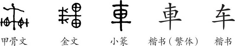 “车”是象形字。甲骨文是一辆车子的俯视图,金文的形体基本上与甲骨文相同。小篆的形体仅保留了一个车轮。隶变后楷书写作“車”。汉字简化后写作“车”。