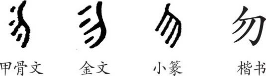 “勿”是象形字。甲骨文像云层间射出阳光之形,用以表示云的形色。金文大致相同,小篆整齐化。隶变后楷书写作“勿”。
