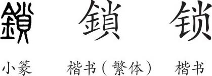“锁”是形声字。小篆形体从金,声。隶变后楷书写作“鎖”。汉字简化后写作“锁”。