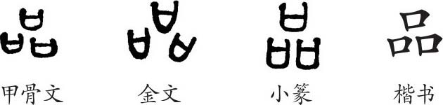 “品”是会意字。甲骨文中的“口”表示器物之形,从三“口”会器物众多之意。金文和小篆承接甲骨文。隶变后楷书写作“品”。