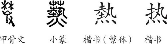 “热”是象形字。甲骨文像一个人手举火把之形,表示点燃火把。小篆另加义符“火”。隶变后楷书写作“熱”。汉字简化后写作“热”。