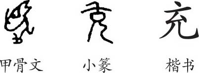 “充”是象形字。甲骨文像一个长得很肥硕的大猩猩的样子,用来表示肥硕之意。隶变后楷书写作“充”。