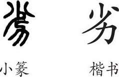 “劣”是会意兼形声字。小篆从力,从少,会力气弱小之意,力兼表声。隶变后楷书写作“劣”。