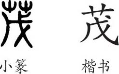 “茂”是形声字。小篆从艸,戊声。隶变后楷书写作“茂”。