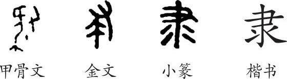 “隶”是会意字。甲骨文从又(手)持一兽,会用手捕获一兽加以整治的意思。金文稍减,小篆整齐化。隶变后楷书写作“隶”。