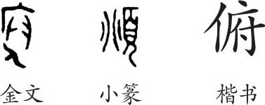 “俯”的本义为低头。如成语“俯首帖耳”。引申指弯腰屈身。如成语“俯拾皆是”意为只要弯下身子来捡,到处都是。