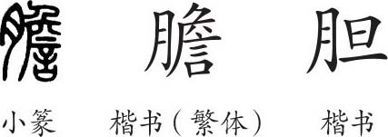 “胆”是形声字。小篆从肉(月),詹声。隶变后楷书写作“膽”。汉字简化后写作“胆”。