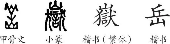 “岳”本是象形字。甲骨文像上下多层山岳的形状。小篆变为从山、獄声的形声字。隶变后楷书写作“嶽”。汉字简化后写作“岳”。