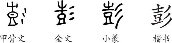 “彭”是会意字。甲骨文像一面架起的鼓,右边三点表示鼓声,会击鼓发出的声音之意。隶变后楷书写作“彭”。