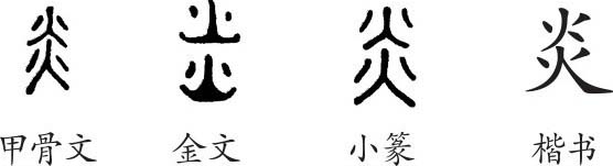“炎”是会意字。甲骨文上下是两把大火,表示火光冲天,会火焰冲腾之意。金文、小篆的形体与甲骨文基本相同。隶变后楷书写作“炎”。