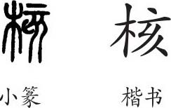 “核”是形声字。小篆从木,亥声。隶变后楷书写作“核”。