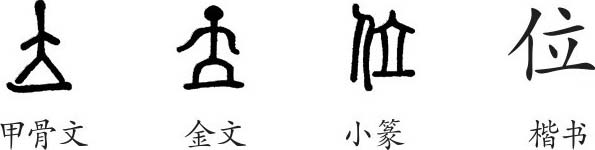 “位”是指事字。甲骨文、金文写作“立”,从大(正面人形),从一(表示地)。隶变后楷书写作“位”。