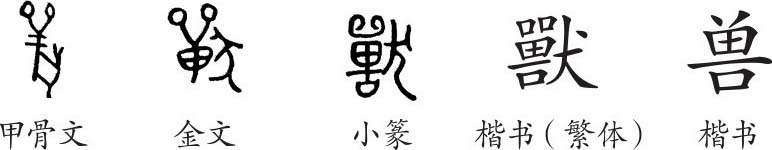 “兽”是会意字。甲骨文从單,从犬,会带着猎叉和猎犬打猎之意。金文的形体略有变化。小篆承接金文而来。隶变后楷书写作“獸”。汉字简化后写作“兽”。