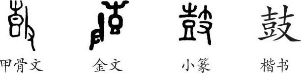 “鼓”是会意字。甲骨文像一只手拿着鼓槌敲打鼓的样子。金文是左手拿槌敲击右边的鼓。小篆承接金文而来。隶变后楷书写作“鼓”。