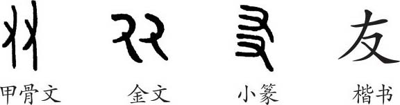 《说文·又部》:“友,同志为友。从二又。相交友也。”(友,志趣相同为友。由两个“又”(手)字会意,表示相交为友的意思。)